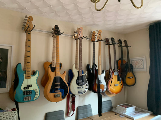 The GearHooks® guitar wall hooks are a unique and stunning way to store and display your instruments in just 1M of wall space. As well acoustic and electric guitars, you can also mount other instruments like mandolins, ukuleles or banjos onto each rack.