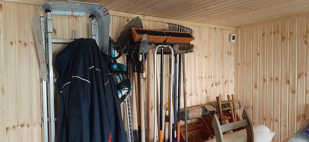 Garden tool storage for sheds and garages with 5 hooks for 30+ tools